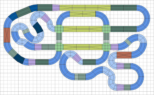 Son circuitos totalmente planos, raro en mis diseños en los que he llegado a 8 plantas, pero por ejemplo el primero aunque plano tiene truco, ya que tiene cuatro cruces a nivel que permiten hacer lo mismo que se conseguiría con cuatro puentes, aunque en este caso seria más segura la integridad de la carroceria de los autos.